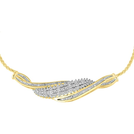 1/3 Carat T.W. Diamond 10kt Yellow Gold Fashion NecklacePositively radiant and unique. This bypass-style necklace takes three round diamonds and showcases them side by side on the diagonal. What really makes this necklace extra special are the 1/3 ct. t.w. of diamonds and the swirls of tapered baguette stones that provide an uninterrupted flow of pure sparkle. Fashioned in 10kt yellow gold, this necklace is sure to please.