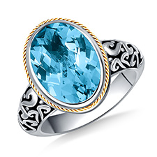 Blue Topaz Cushion Cut Gemstone Ring Engraved in Sterling Silver and 18K Yellow GoldBlue Topaz Cushion Cut Gemstone Ring Engraved in Sterling Silver and 18K Yellow Gold