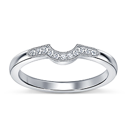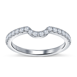 The diamond wedding band features elegant curve in secure prong setting. The graceful curve allows the band to stack against your engagement ring for a nesting match.