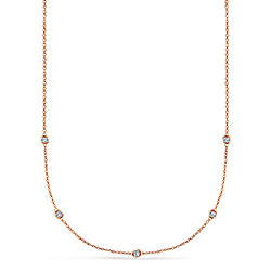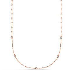 The cool gleam of 14K rose gold is enlivened with stations of glittering diamonds. Evenly spaced bezel set diamonds give a fresh and modern look to this 16" princess length necklace. Expertly...