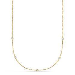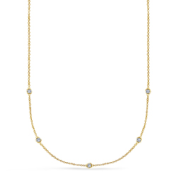 Bezel set diamonds delight the eye from their gleaming bezel settings in this stylish station necklace. Expertly crafted in 18K yellow gold, this 16" necklace features a secure lobster claw...