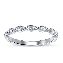 French cut set sparkling diamonds adorn this petite crescent shaped ring which is perfectly designed to compliment an engagement ring.