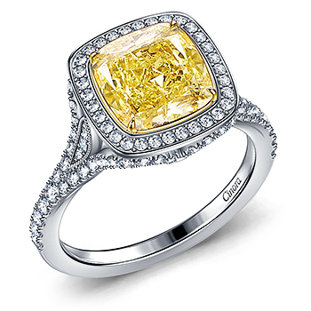 Fancy Yellow Cushion Cut Diamond Split Shank Engagement Ring in 18K White Gold