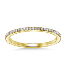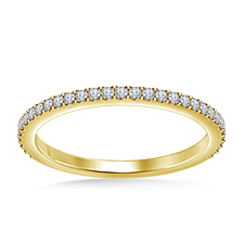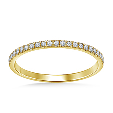 Slender and delicate, this petite wedding band is expertly crafted in gleaming 14K yellow gold and features brilliant diamonds in secure prong settings three quarters of the way around...