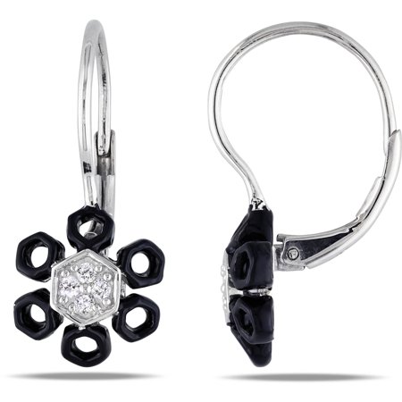 These Diamond Accent Two-Tone Sterling Silver Flower Earrings have a fun modern design. They feature eight round-cut, prong-set white diamonds at the center, surrounded by a honeycomb flower design in black. These diamond accent earrings have an eye-catching...