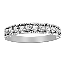This 14K white gold band is embedded all over with round diamonds that are prong set within a milgrain border. It can be worn alone or with the option as a stackable set. It is also available in Pink...