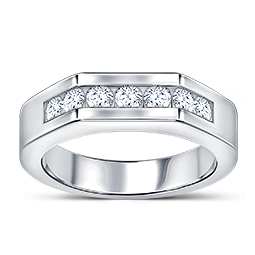 This 14k white gold men's diamond ring features seven round channel set diamonds.