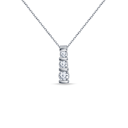 This 14K white gold round 3 stone pendant features 1/2 carat of bar set diamonds which suspends from a 14K white gold 18 cable chain.