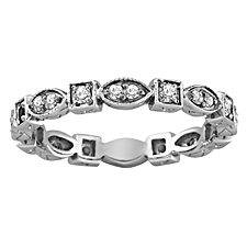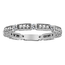 This 14K white gold eternity band displays an alternating design of round prong-set diamonds. It can be worn alone or with the option as a stackable set.