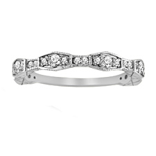This 14K white gold eternity band showcases an interesting design of alternated one and three round diamonds. It can be worn alone or with the option as a stackable set. It is also available in Pink a