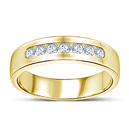 Show off with this enduring 14k yellow gold men's diamond ring featuring seven round diamonds in channel setting.
