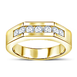 Show off with this enduring 18k yellow gold men's diamond ring featuring seven round diamonds in channel setting.