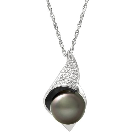 9-9.5mm Black Round Tahitian Pearl and Diamond-Accent Sterling Silver Fashion Pendant, 18