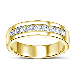 Make your love resonate with this enduring 14k yellow gold wedding band, showcasing nine illuminating channel-set diamonds.