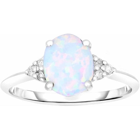 Created Opal and .08 Carat T.W. Diamond 10kt White Gold Ring: Metal: 10kt white goldFinish: high polishProng settingGemstone: created opalGemstone: 9mm x 7mm oval6 diamondsDiamond weight:...