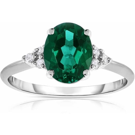 Created Emerald and .08 Carat T.W. Diamond 10kt White Gold Ring: Metal: 10kt white goldFinish: high polishProng settingGemstone: created emeraldGemstone: 9mm x 7mm oval6 diamondsDiamond...
