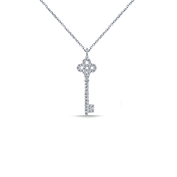 Look at this 14K white gold key shape diamond pendant enhanced with prong-set round diamonds.