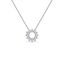 This 14K white gold pendant features 12 prong set round diamonds lined in a circle design. Comes with an 18 cable chain in 14K white gold.